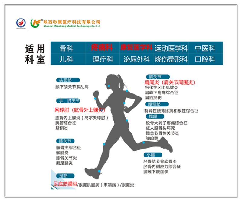 在臨床上應用于疼痛科、骨科、康復科、理療科、中醫科、運動醫學科等科室,廣泛用于網球肘、跟腱炎、跟腱末端病、髕尖末端病、鈣化性肌腱炎等一系統腱骨結合處病變和腱病的治療。